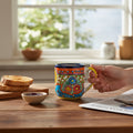 Discover the authenticity of Talavera, an iconic Mexican ceramic known for its bright colors and floral and geometric patterns. This mug is handcrafted by artisans in Puebla and then painstakingly painted before firing to achieve a smooth, long-lasting glaze. Its comfortable size and sturdy handle provide a pleasant grip for your daily hot drinks.